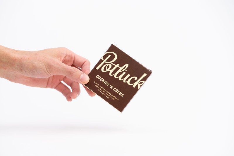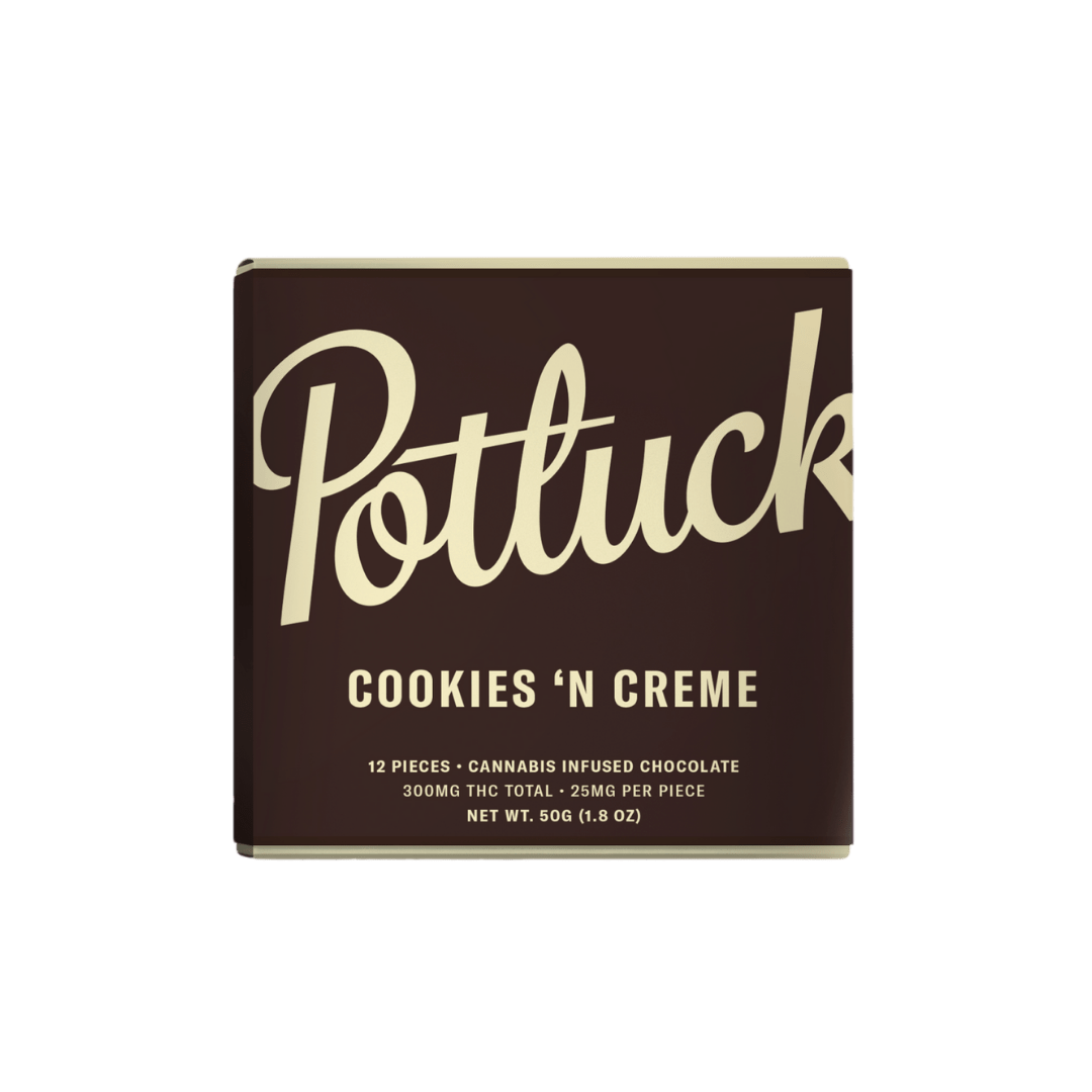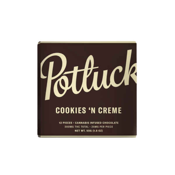 Developed in collaboration between the most notable pioneers in the Canadian edibles extracts industry, Potluck chocolate bars are created with the modern edibles connoisseur in mind. You take your edibles seriously; so do we. Our chocolate bars are crafted with diligence and precision by the Potluck team to provide an accessibly – priced experience without compromising purity or taste: that’s why we use only all – natural, high quality flavours and full spectrum edibles oils and isolates. Ideal for dessert lovers who prefer their milk and cookies served with a modern twist, our Cookies and Creme bar contains 300mg THC divided into twelve 25mg pieces.